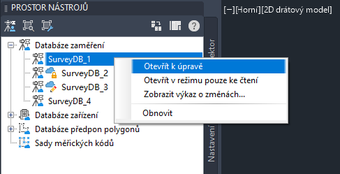 - V Prostoru nástrojů klepněte na kartě Zaměření pravým tlačítkem na knihovnu Zeměměřické databáze.