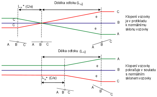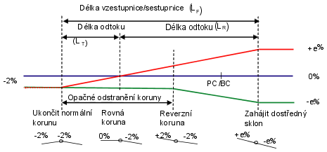 Následující ilustrace ukazuje směrově nerozdělenou vozovku jako typ koridoru a střechovitý příčný profil. Během procesu klopení vozovky prodělá jednoduchá vozovka se základním střechovitým příčným sklonem klopení vozovky ze střechy do dostředného sklonu (odebrání nepříznivého vrcholu). Na této ilustraci je odebrání nepříznivého vrcholového bodu vzdálenost od položky Konec základního střechovitého sklonu k položce Dostředný sklon:
