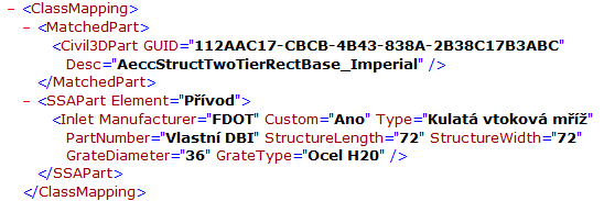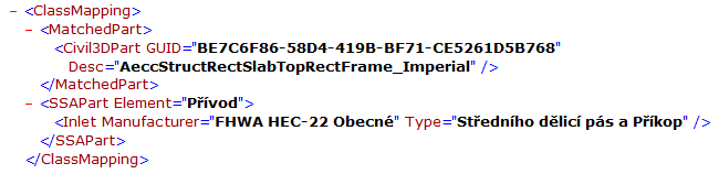 <ClassMapping> <MatchedPart> <Civil3DPart GUID = "260FBCAD-7BFC-4DC4-AD9C-84D552C799F5" Desc = "InltCurb1"/> </MatchedPart> <SSAPart Element = "Inlet"> <Inlet Manufacturer = "FDOT" PartNumber = "Curb Inlet - Type 1"/> </SSAPart> </ClassMapping>