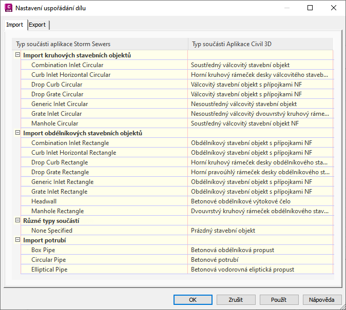 Karta Import umožňuje výběr rodiny součástí aplikace Autodesk Civil 3D (na pravé straně), které chcete použít u všech dostupných typů součástí rozšíření aplikace Storm Sewers. Typ součásti rozšíření aplikace Storm Sewers představuje pevný seznam. Toto mapování by mělo být rovno mapování exportu, aby rodiny součásti zůstaly stejné.