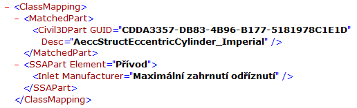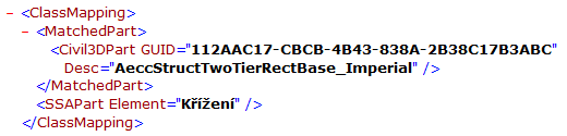 Část souboru XML odpovídající součásti aplikace Autodesk Civil 3D je ohraničena počáteční značkou <MatchedPart> a koncovou značkou </MatchedPart>. U každé součásti aplikace Autodesk Civil 3D nebo více součástí se bude ID součásti (GUID skupiny součástí) aplikace Autodesk Civil 3D a popis nacházet v odpovídající součásti konstrukčního prvku.
