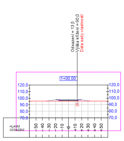 Následující obrázek znázorňuje příklad zahrnutí dat sady vlastností (červeně) do popisku křížení, kde „data sady vlastností“ představují data, která chcete použít u návrhové linie.