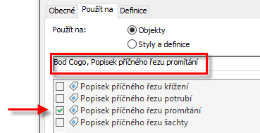 Pokud chcete do stylů popisků promítání zahrnout data sady vlastností, je nutné kromě typu objektu, jehož promítání se zobrazuje v zobrazení příčného řezu, vybrat ještě typ objektu Popisek příčného řezu promítání.