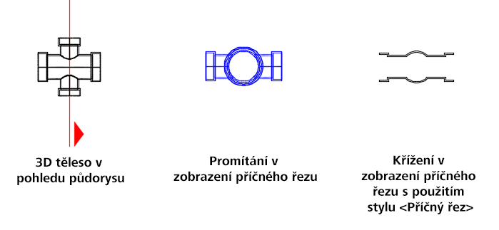 U 3D těles lze jako styl značky křížení také použít možnost <Příčný řez>. Pokud vyberete styl <Příčný řez>, nakreslí se těleso tak, že znázorňuje skutečnou pozici, ve které se s ním stopa příčného řezu kříží.