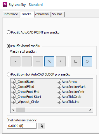 Styly značek lze nastavit tak, aby používaly body aplikace AutoCAD, vlastní symboly značek nebo bloky.