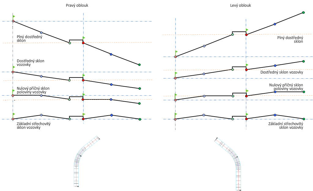 Vysvětlení diagramů klopení vozovky najdete v části Metody klopení osy otáčení okolo bodů otáčení.