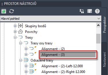 Osové trasy ve stromu Prospektoru. Tento příkaz slouží k rychlému vyhledání umístění protínající se trasy ve stromu Prospektoru.