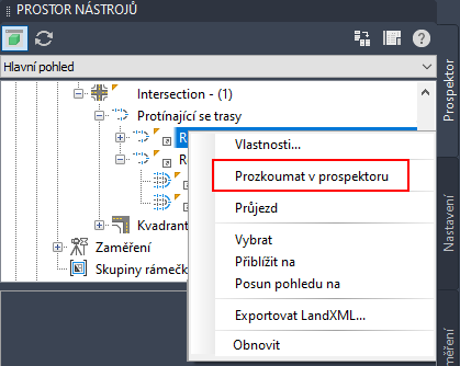 Chcete-li použít tento příkaz, klepněte pravým tlačítkem na knihovnu Protínající se trasy a zvolte možnost Prozkoumat v Prospektoru.