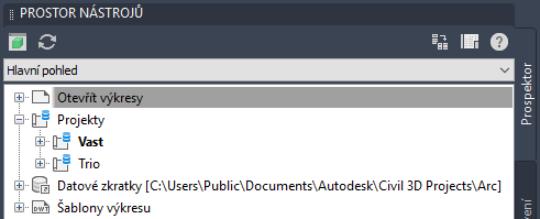 Hlavní pohled stromu Prospektor obsahuje čtyři kolekce související s výkresy a projekty: Otevřít výkresy, Projekty, Datové zkratky a Šablony výkresu.
