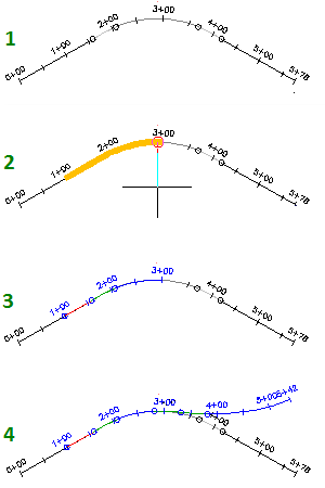 Vybrat zdrojovou trasu (1) a poté určením rozsahu staničení (2) vytvořit trasu (3). Přidáním podentit do nové trasy (4) vytvořit trasu, která se připojuje k existující trase nebo z ní vychází.