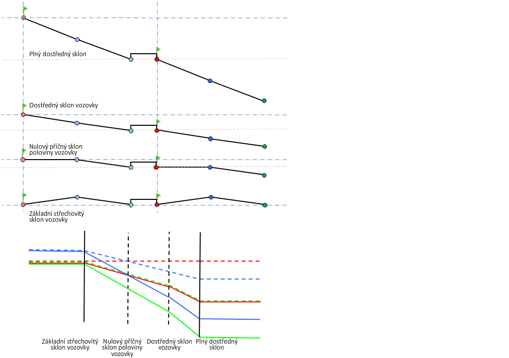 Vysvětlení diagramů klopení vozovky najdete v části Metody klopení osy otáčení okolo bodů otáčení.