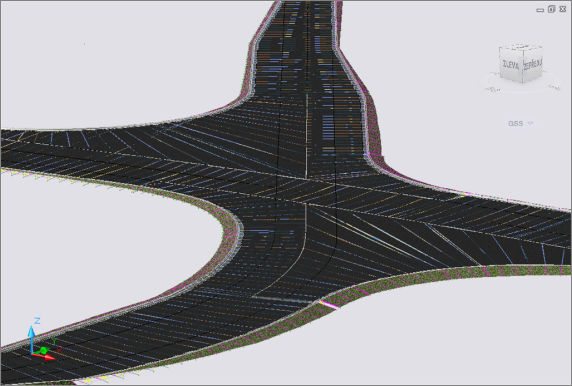 Chcete-li vytvořit 3D křižovatky, která obsahuje koridor, budete nejprve muset vytvořit ve výkresu geometrii komunikace (osové trasy komunikace a profily) a stávající povrch terénu. Jakmile jsou tyto komponenty přítomny ve výkresu, můžete pokračovat s využitím Průvodce vytvořením křižovatky. Průvodce vás požádá o výběr místa ve výkresu, kde se protínají dvě trasy středové osy komunikace.