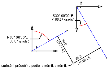 | směrník 1, směrník 2 | Směrníky pro přímky z existujících bodů. Směrníky určují směr každého vektoru a jsou uvedeny v aktuálních úhlových jednotkách. |