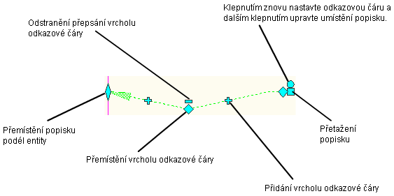 se zobrazují pouze na výsledných odkazových čarách. Tyto uzly slouží k vytvoření dalších vrcholů. Poznámka: Jestliže typ odkazové čáry v přetaženém stavu stylu popisku je nastaven na typ spline, provede se přizpůsobení typu spline aplikace AutoCAD v bodech vrcholů.