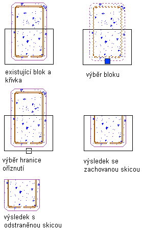 . Vše z původně vybrané skici mimo hranici oříznutí je vymazáno. Jestliže zvolíte, aby se vymazala hranice oříznutí, jsou hranice překresleny pro všechny entity s uzavřenou hranicí uvnitř oblasti oříznutí. Ale všechny objekty s otevřenou hranicí, které byly oříznuty, zůstanou otevřené.