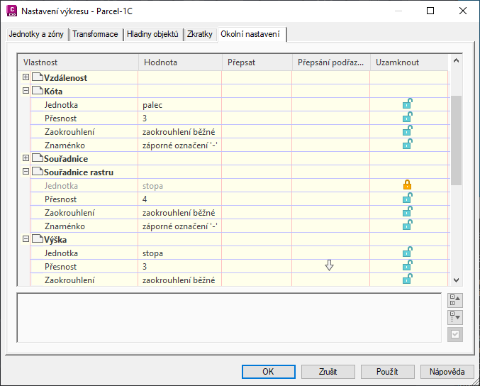 Na kartě Okolní nastavení je ve sloupci Přepsání podřízeného zobrazena šipka vedle každého nastavení, které je změněno pro jeden či více objektů ve výkresu. Tento přepis můžete zrušit klepnutím na šipku, a klepnutím na ikonu zámku lze zablokovat kterékoliv nastavení, zamezí se přepsání na úrovni objektu.