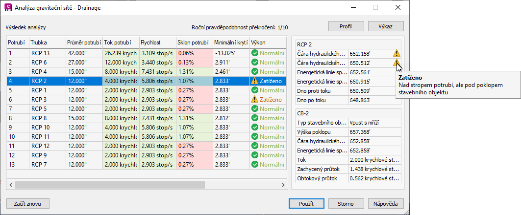 Když v tabulce výsledků vyberete řádek, zobrazí se na pravém panelu podrobné informace o potrubí a stavebním objektu vybrané linie.