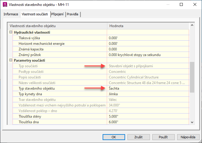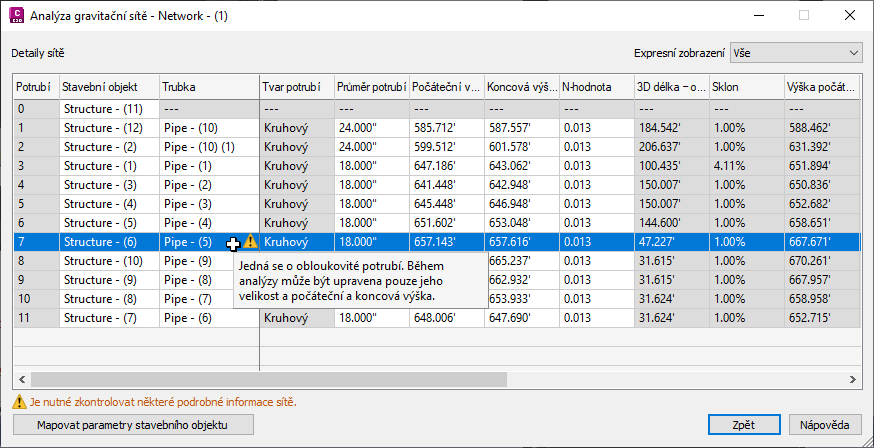 Když namapujete parametry a použijete je u stavebních objektů v existujících potrubních sítích, nebudete muset při použití příkazu Analýza gravitační sítě ručně zadávat hodnoty.