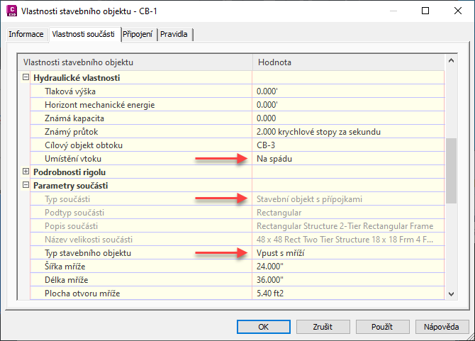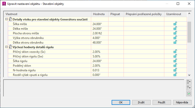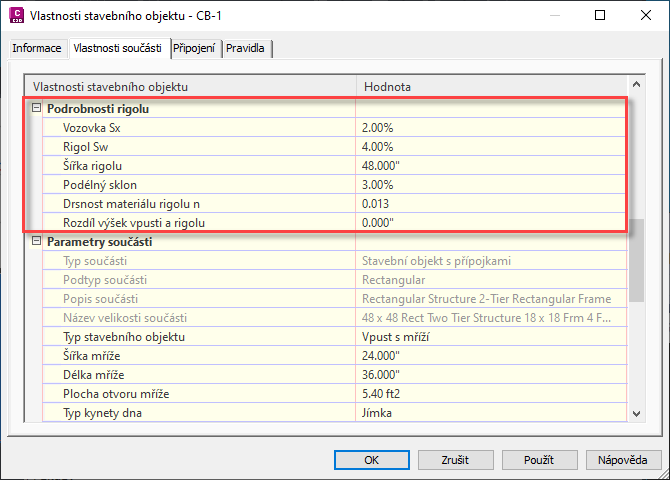 V části Podrobnosti rigolu v dialogu Vlastnosti stavebního objektu můžete definovat vlastnosti plochy vozovky okolo vtoku. Tyto vlastnosti slouží k výpočtům analýzy vtoku u příkazu Analýza gravitační sítě.
