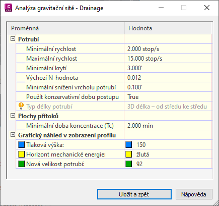 Pomocí příkazu Analýza gravitační sítě můžete změnit velikost potrubí, znovu nastavit dna potrubí a vypočítat linie energetického spádu a čáry hydraulického sklonu podle standardů definovaných v dokumentu HEC-22.