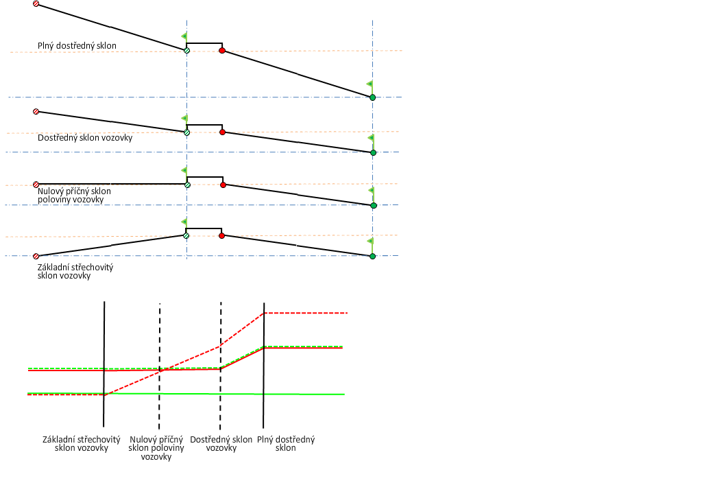 Vysvětlení diagramů klopení vozovky najdete v části Metody klopení osy otáčení okolo bodů otáčení.