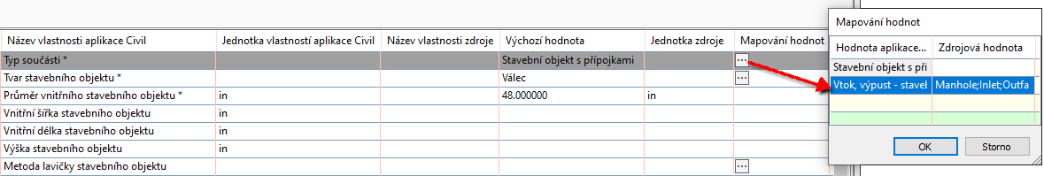 Chcete-li přenést šachty, vtoky a výtoky jako typy součástí stavebních objektů s přípojkami, můžete u daných typů součástí nastavit mapování hodnot. Pokud jsou například v datech ArcGIS určeny hodnoty atributů Šachta, Vtok a Výtok tak, aby indikovaly typ stavebního objektu, můžete tyto hodnoty zadat v dialogu Mapování hodnot.