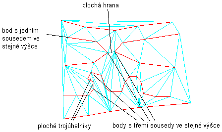 Podmínka více vrstevnic, která nastává, když má bod více sousedních bodů se stejnou výškou, se zpravidla vyskytuje v ploché oblasti povrchu. Pokud se zjistí tato podmínka, lze problém vyřešit pomocí operace Minimalizovat ploché oblasti. Jestliže je bod na hranici povrchu, plochá oblast může být pouhým neúmyslným pozůstatkem triangulačního procesu. Tyto nechtěné trojúhelníky je možné odebrat pomocí příkazu Odstranit úsečku nebo přidáním skryté hranice.