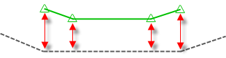 Na následujícím obrázku je vidět zeleně nakreslená návrhová linie, která s kladným výškovým odsazením kopíruje výšky povrchu (znázorněné šedou přerušovanou čarou). Tato návrhová linie byla vytvořena tak, aby byla relativní vzhledem k povrchu.