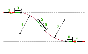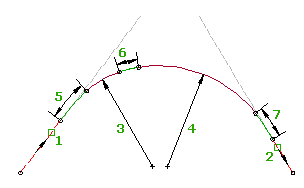 Při úpravě tečen připojení (1, 2) se poloměry oblouků (3, 4) a délky přechodnic (5, 6, 7) nezmění. Body připojení a délky oblouků se přizpůsobí úpravám tečen připojení. Kterákoli z přechodnic může mít nulovou délku.