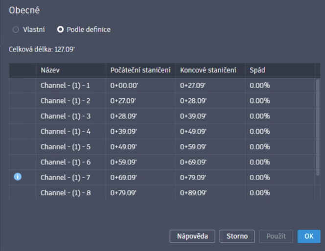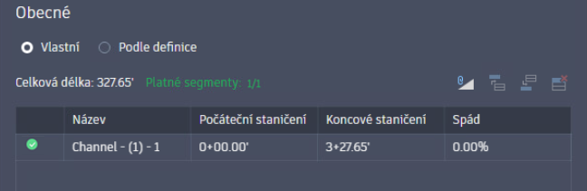 Počáteční staničení. Zobrazí počáteční staničení každého segmentu kanálu. Tato hodnota musí být v definovaném rozsahu staničení, jinak se zobrazí chyba.