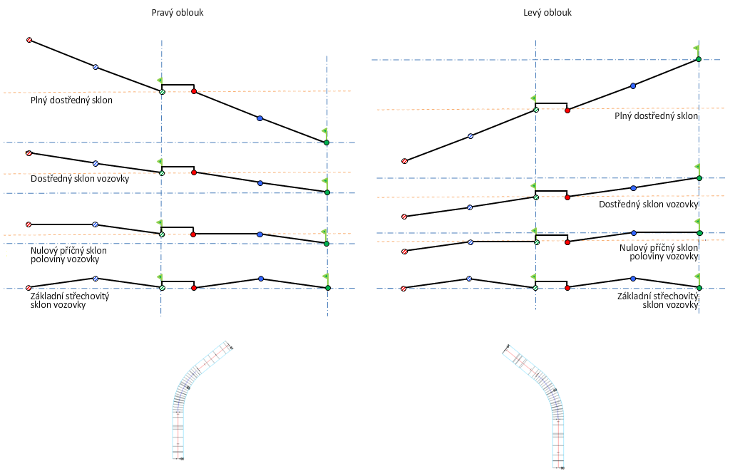 Následující obrázek uvádí metodu natočení na pravé straně pro směrově rozdělenou vozovku se střechovitým příčným sklonem.