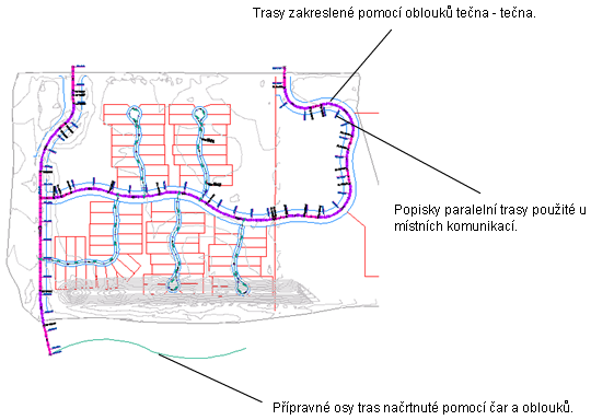 Trasu vytvoříte jako kombinaci úseček, oblouků a přechodnic, které jsou zobrazeny jako jeden objekt.
