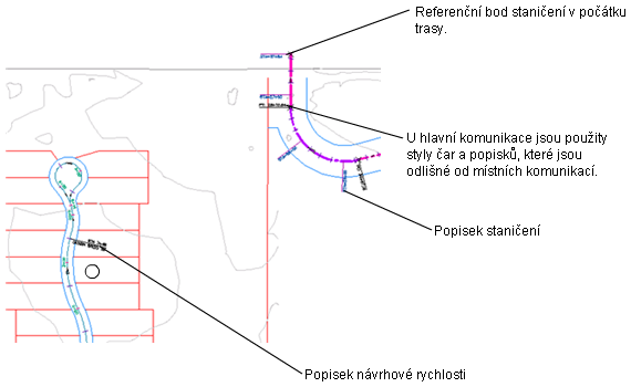 Vizuální vzhled komponent trasy a popisků řiďte pomocí stylů. Můžete vytvořit specifické styly pro použití v různých fázích projektu. Když vytváříte trasu, určíte styl pro objekt trasy a styly pro popisky trasy. V dialogu Popisky tras lze vytvořit skupiny stylů pro popisky tras a tyto popisky následně uložit jako sadu popisků, kterou lze použít u jiných tras.