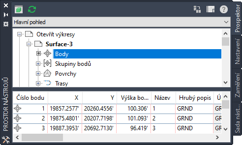 Okno Prostor nástrojů je integrální součástí uživatelského rozhraní umožňující přístup k příkazům, stylům a datům. Použijte jej k přístupu ke kartám Prospektor, Nastavení, Zaměření a Panel nástrojů. Chcete-li získat přístup k příkazům, klikněte pravým tlačítkem na každou kolekci nebo položku na těchto kartách.
