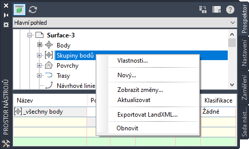 Karta Nastavení slouží ke správě nastavení objektů, stylů a dalších položek výkresu, například formátů souborů bodů, sad klíčů popisu a sad parametrů zemního tělesa.