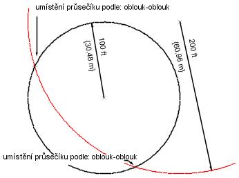 Průsečíky se nacházejí mezi obloukem o poloměru 100 se středem v Bodu 1 a obloukem o poloměru 200 se středem v Bodu 2.