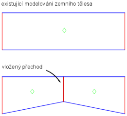 - Můžete vybrat umístění mezi dvěma existujícími modelováními zemního tělesa. Počáteční a koncový bod přechodu jsou definovány existujícími promítanými liniemi.