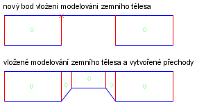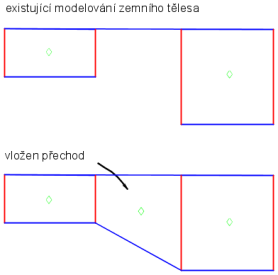 Dále budete někdy vyzvání k vytvoření přechodů, když použijete příkaz Vytvořit zemní těleso. K tomu dojde, když počáteční bod nového zemního tělesa bude ležet uvnitř existujícího zemního tělesa nebo se jej bude dotýkat.