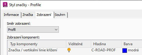 Komponenta svislé čáry křížení/značky řídí jak zobrazení značky (používané k zobrazení profilů křížení, návrhových linií, polygonů zaměření a 3D křivek), tak zobrazení svislé čáry křížení (používané k zobrazení křížení trasy).