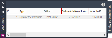 Použijte tento pohled k zobrazení a úpravám číselných dat o obloucích a tečnách v jednotlivých vrcholech výškového polygonu nebo pro určitou subentitu v profilu.