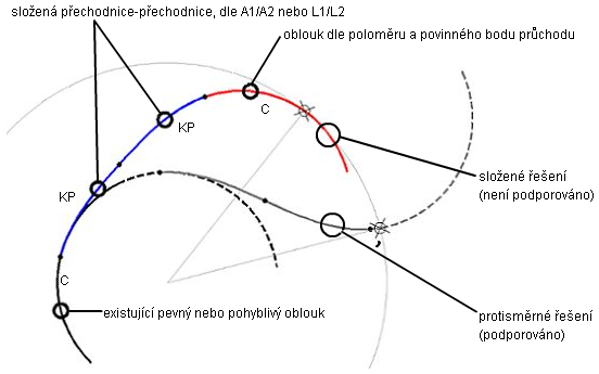 Plovoucí protisměrný oblouk s přechodnicemi přidejte v situacích, kdy potřebujete dvě přechodové protisměrné přechodnice obrácené proti sobě, přičemž geometrie oblouku musí procházet určeným bodem.