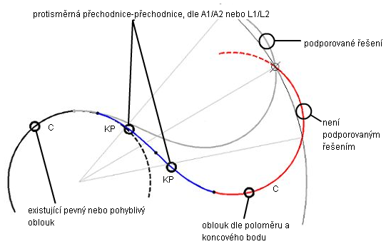 Přidání plovoucího protisměrného oblouku s přechodnicemi (z oblouku, dva povinné body průchodu) mimo oblouk