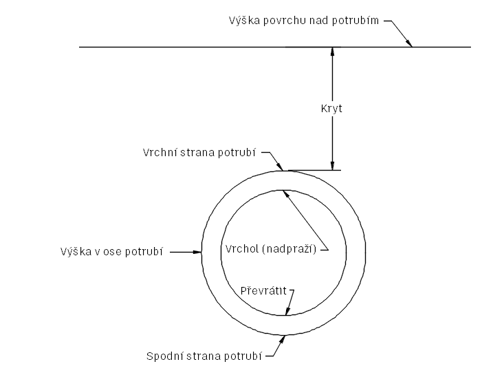 Překrytí nebo hloubka Odkazuje na hloubku materiálu nad nejvyšší vnější částí potrubí.