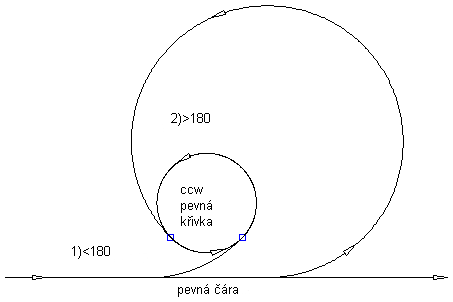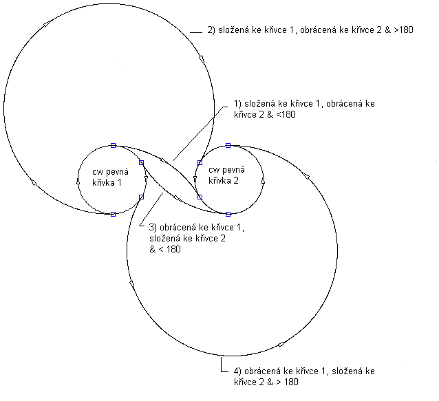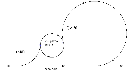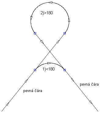 Následující ilustrace ukazuje volný oblouk mezi dvěma pevnými tečnami. Existují dvě řešení založená na sevřeném úhlu oblouku: