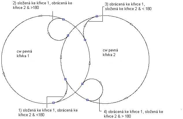 Následující ilustrace ukazuje plovoucí oblouk mezi překrývajícím obloukem ve směru hodinových ručiček a obloukem proti směru hodinových ručiček: