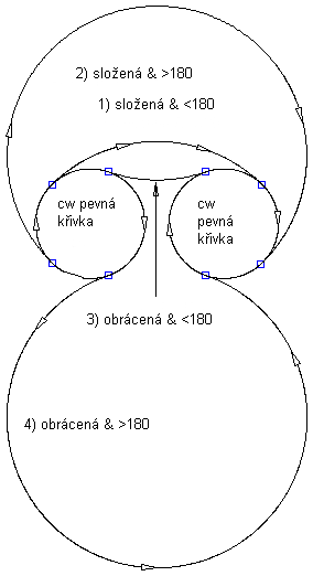 Následující ilustrace ukazuje volný oblouk mezi dvěma pevnými oblouky ve směru hodinových ručiček: