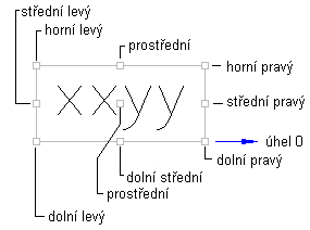 Určuje místo na textové komponentě, které je připojeno k bodu ukotvení. Připojovací body jsou vypočteny na základě obdélníku, který obklopuje text, jehož velikost je určena zahrnutím hodnoty mezery zadané v kategorii Hranice. V následujícím obrázku jsou znázorněny připojovací body textu: