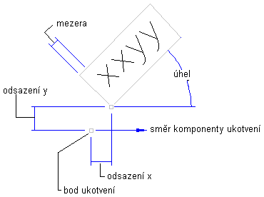 Směr v ose X je určen objektem, ke kterému je textová komponenta ukotvena. Pokud je textová komponenta ukotvena k bodu vložení popisku, je směr v ose X určen vzhledem k následujícímu nastavení Reference orientace na kartě Obecné: