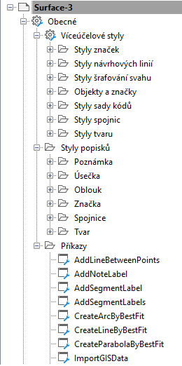 Obecné Styly popisků se používají pro úsečky, oblouky, návrhové linie a koridory. Tato knihovna také obsahuje styly popisků pro Poznámky, které nejsou specifické pro objekt.