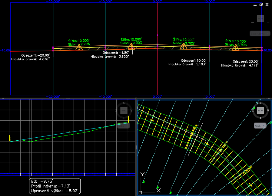 Když vyberete úsek oprav v rámci koridoru oprav, zobrazí se tři výchozí výřezy, které vám umožní zobrazit příčný řez koridoru pro staničení (zobrazení příčného řezu), vertikální profil pro příčný řez (zobrazení profilu) a umístění příčného řezu koridoru podél trasy koridoru oprav (pohled půdorysu).